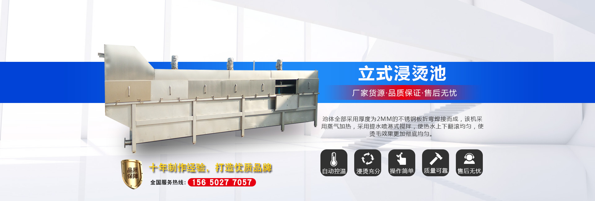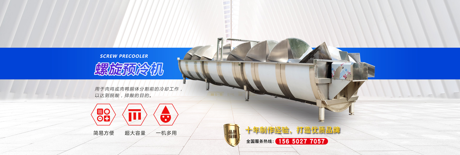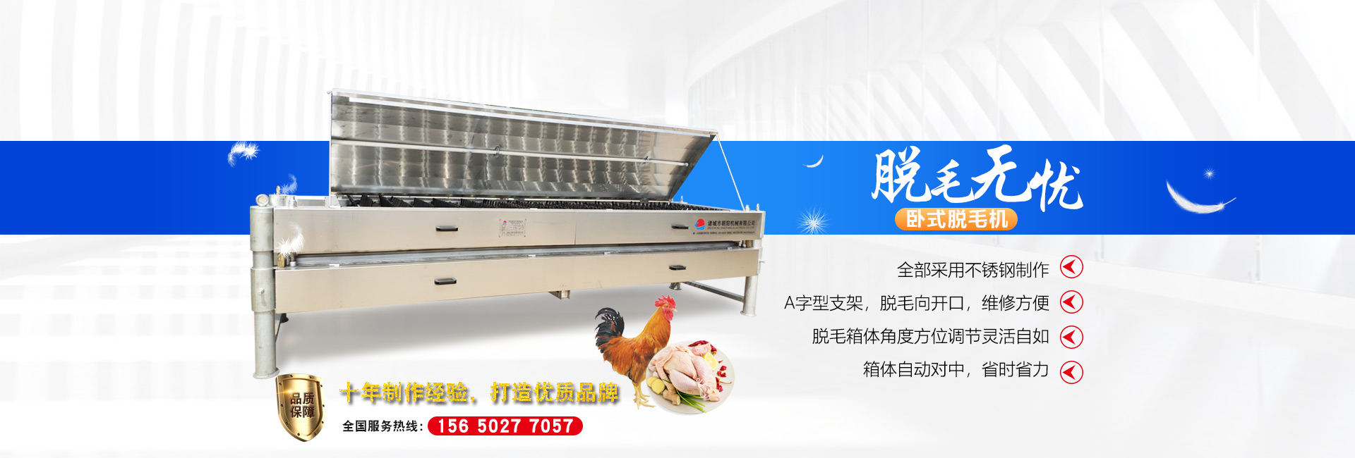 公司長期與國內(nèi)外屠宰加工企業(yè)合作,走引進——消化——創(chuàng)新和自主研發(fā)相結(jié)合的道路,在國內(nèi)外同類產(chǎn)品的基礎(chǔ)上,不斷更新和改造。公司主要設(shè)備有:A字型立式脫毛機、臥式脫毛機、強力噴淋機、松毛機、浸燙池、螺旋預冷機、禽籠清洗機、電暈機、兔扯皮機、兔割前爪/后爪機、剝胗機、自動洗鉤機、螺旋燙爪機、雞爪脫皮機、分割輸送帶等屠宰用設(shè)備。其中,公司獨力發(fā)明生產(chǎn)設(shè)計的“電動調(diào)節(jié)脫毛機”及“自動控水控溫浸燙池”順利通過知識產(chǎn)權(quán)局的實質(zhì)性審查。公司所生產(chǎn)的設(shè)備 可與國外同類產(chǎn)品配套使用,設(shè)備遠銷阿爾及利亞、澳大利亞等中東、非州等并建立了長期穩(wěn)定的合作關(guān)系。